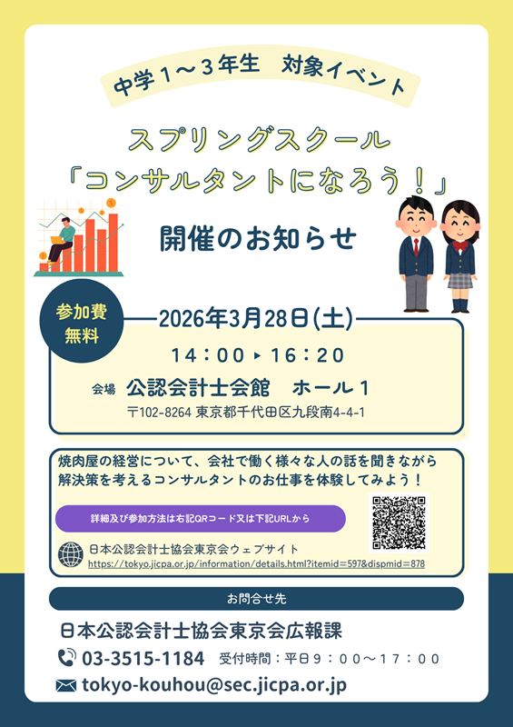 日本公認会計士協会東京会では会計教育イベント「スプリングスクール2026」を3月20日(金・祝)に小学生、3月28日(土)に中学生を対象に開催いたします。 イベントは無料となっておりますので、是非ご参加くださいますようご案内いたします。