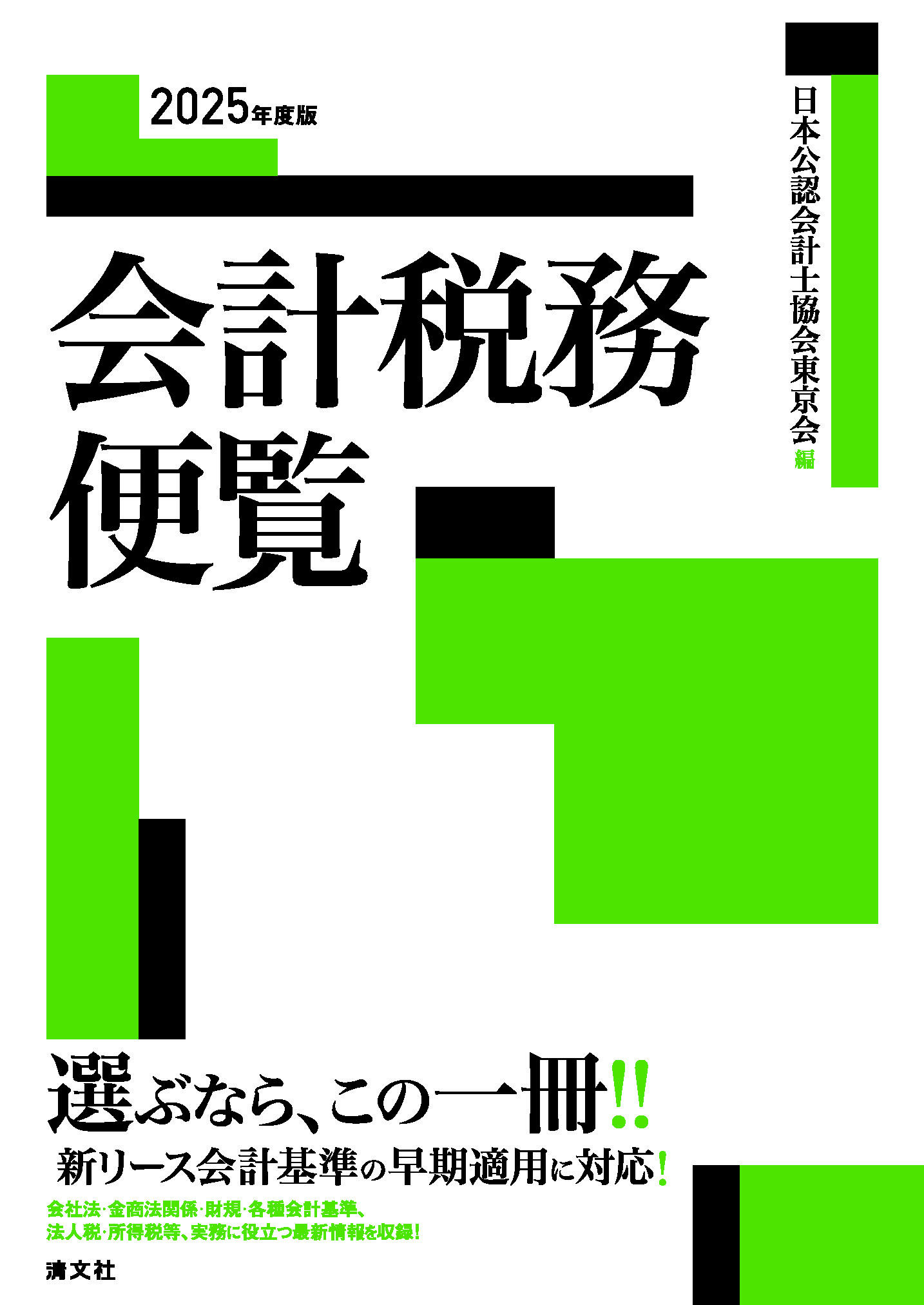 必要な情報はコンパクトに編集! 本書は、会計・税務に関する実務情報を項目ごとに整理し、網羅的かつコンパクトにまとめたものです。1979(昭和54)年の発刊以来、初学者から第一線の実務家まで幅広い方々にご好評いただき、毎年改訂を重ねています。2025年度版では2025年6月30日現在における会社法、金融商品取引法、法務省令、会計上及び監査上の取扱い、法人税法、所得税法その他の税法について最新の内容を収録しました。主な改正項目を巻頭の「最近の改正事項」にまとめ、実務家にとって使い勝手の良い 1 冊になっています。 会員・準会員の方はこちらから内容をご覧いただけます(ログインが必要です)。